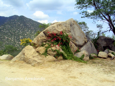 Te invitaré ahora a hacer una visita a la Sierra de la Laguna en la época en que nos muestra su más espléndida cara, cuando se atavía galanamente luego de las lluvias y el verdor y las flores surgen por todos lados. Veremos rocas gigantescas y luego llegaremos a un auténtico remanso de paz que es el Rancho El Refugio localizado justo donde comienza la zona de San Dionisio. Al ver estas imágenes entenderemos la razón por la cual la Sierra de la Laguna es una "área natural protegida" y, más aun, una Reserva de la Biósfera. Lo que no entenderemos es el por qué la necedad de instalar muy cerca de allí la mina a cielo abierto de El Cardón. Privilegiaremos una vez más a la imagen, dado que no hay necesidad de hacer explicación alguna.