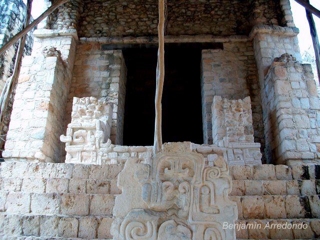 Y llegamos al punto medular de la ciudad sagrada de Ek Balam, la pirámide principal en donde se desarrolla el impresionante decorado en estuco que muestra las fauces de un jaguar y en su interior una serie de esculturas que nos dicen de la maestría de los artistas y decoradores de hace montones de centurias. De eso no te puedo contar mucho pues, la escalinata que vemos tienen una pendiente que para mi se vuelve complicada y prefiero no subir, como quiera, lo mucho que he visto en Ek Balam me ha embriagado y creo que es un recinto de enorme belleza que su apenas kilómetro cuadrado es más que suficiente para adentrarnos en la estética de esta civilización.