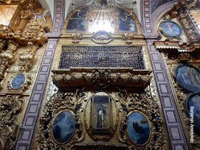 Igual o más impresionante aun, es el cuadro de enorme exquisitez hecho en carey que contiene 25 reliquias, se localiza en el mismo retablo del templo de Santa Rosa, eso nos recuerda aquello de que solo los templos más ricos contenían una buena cantidad de reliquias.
